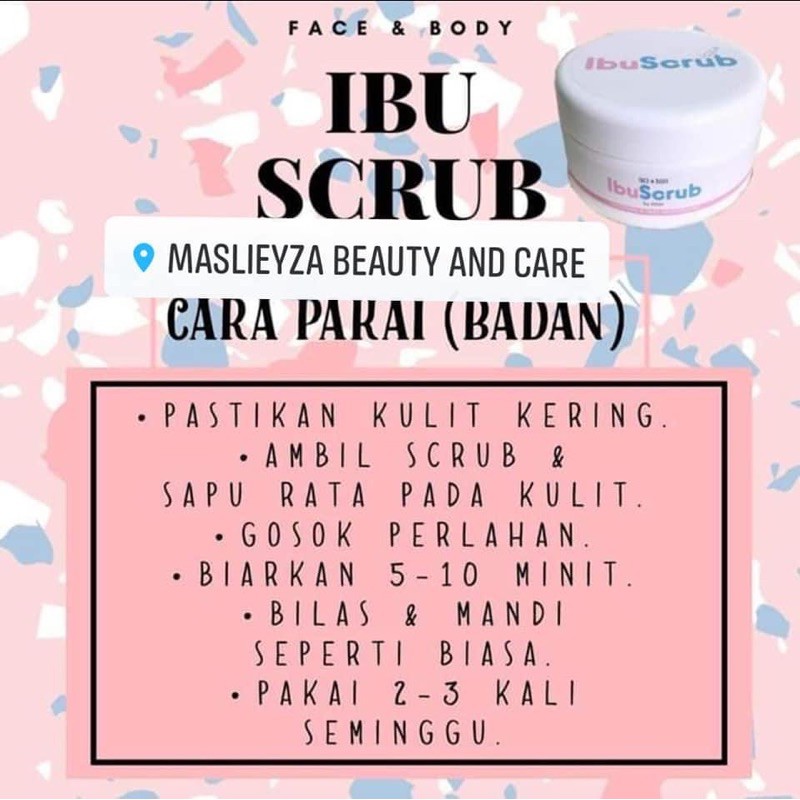 Body scrub juga cara terbaik menghaluskan dan membuat kulit cerah. Sesuai digunakan pada kulit muka dan badan KEBAIKAN IBU SCRUB BY WNA Memutih dan melembutkan kulit muka serta badan Menanggalkan sel kulit mati dan daki-daki pada kulit Memperbaiki tekstur kulit Mencerahkan bahagian-bahagian pelipat seperti ketiak celah paha siku Mencerah serta memudarkan parut pada kulit. Namun agar pemakaiannya maksimal berikut 5 cara menggunakan body scrub yang tepat.